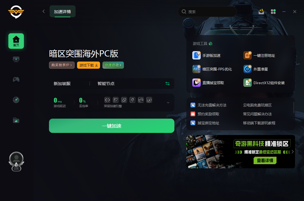暗区突围PC端登不上、登录不了等问题,很多时候都是网络环境不佳导致的。这时,你可以尝试使用网络优化工具,如奇游,来优化你的电脑本地网络环境。具体操作如下:在打开暗区突围PC端的同时,打开奇游,搜索“暗区突围PC端”,然后点击优化按钮。这样,网络问题导致的登录难题就能迎刃而解了。