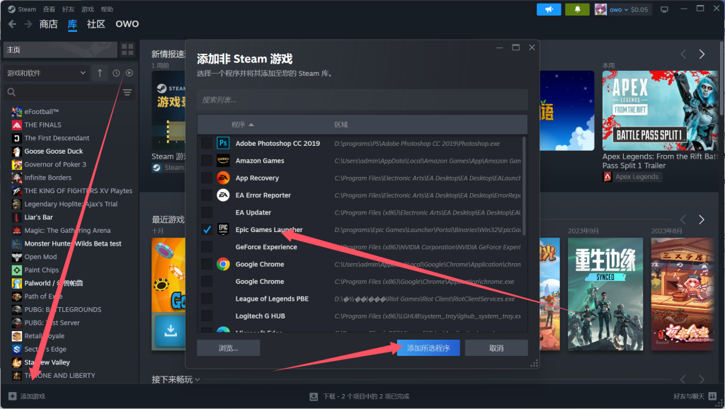 如果你同时安装了Steam和Epic,有个巧妙的方法可以一试。在Steam中点击左下角“添加游戏”-“添加非Steam游戏”,把Epic程序添加进来。之后,你可以直接从Steam中启动Epic程序,这样有时能绕过黑屏问题。