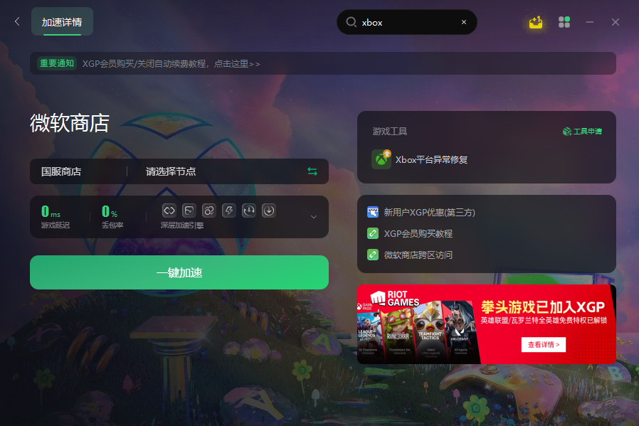 步骤一:先打开奇游加速工具,搜索“微软xgp”进行加速,加速后可以有效优化网络,避免xgp官网进不去、无法开通会员等问题。