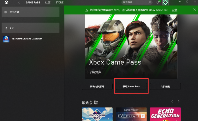 启动Xbox并登录微软账号后,点击主界面“获取game pass”。