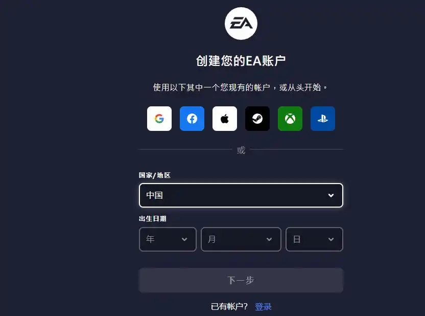 接着选择所在国家或地区,填入出生日期,点击 “下一步”。随后输入电子邮箱地址,创建 EA ID,并设置账户密码。