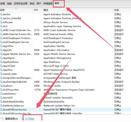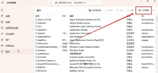 打开任务管理器点【服务】,然后点击右上角【打开服务】