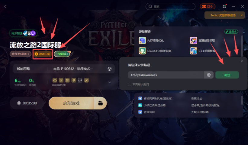 如果想尝试国际服,建议使用奇游加速工具。只需打开奇游,搜索“流放之路”并开启加速,之后就可以直接下载游戏独立安装包了。
