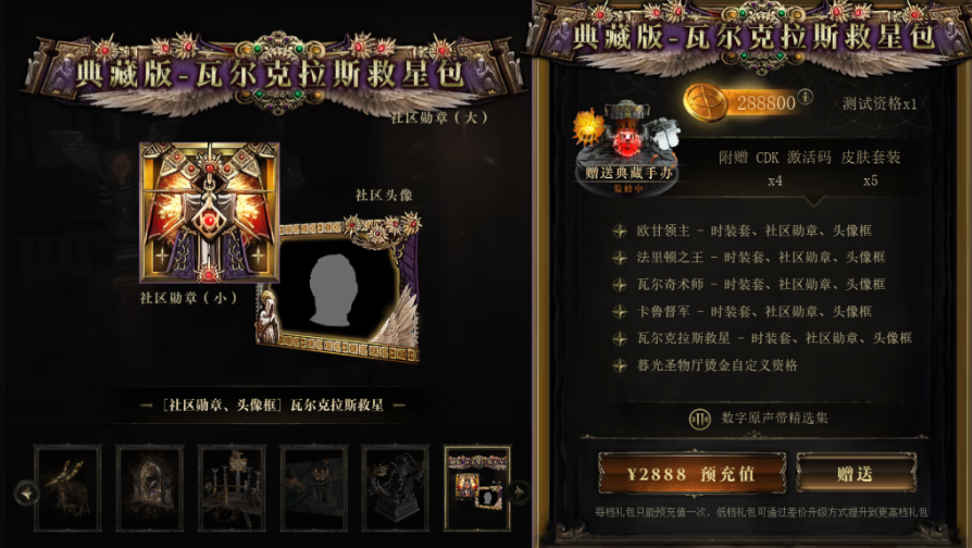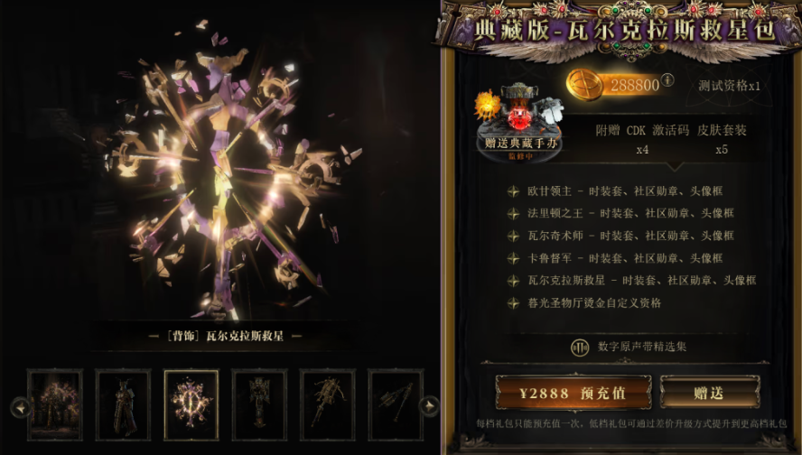 预购方面,基础版礼包售价98元,里面包含9800点券、测试资格和游戏原声带。豪华版分为四档,价格从198元到798元不等,除了基础内容还会额外赠送皮肤套装和测试资格激活码。典藏版定价2888元,里面还有专属手办等实物周边。所有预购玩家还可额外获得国服限定熊猫灵兽“临临”以及980点券。