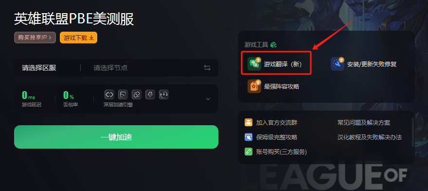 打开奇游,搜索“英雄联盟PBE美测服”,进入加速详情界面找到游戏翻译选项,勾选后点击立即加速。加速完成后重新进入游戏即可享受中文界面。