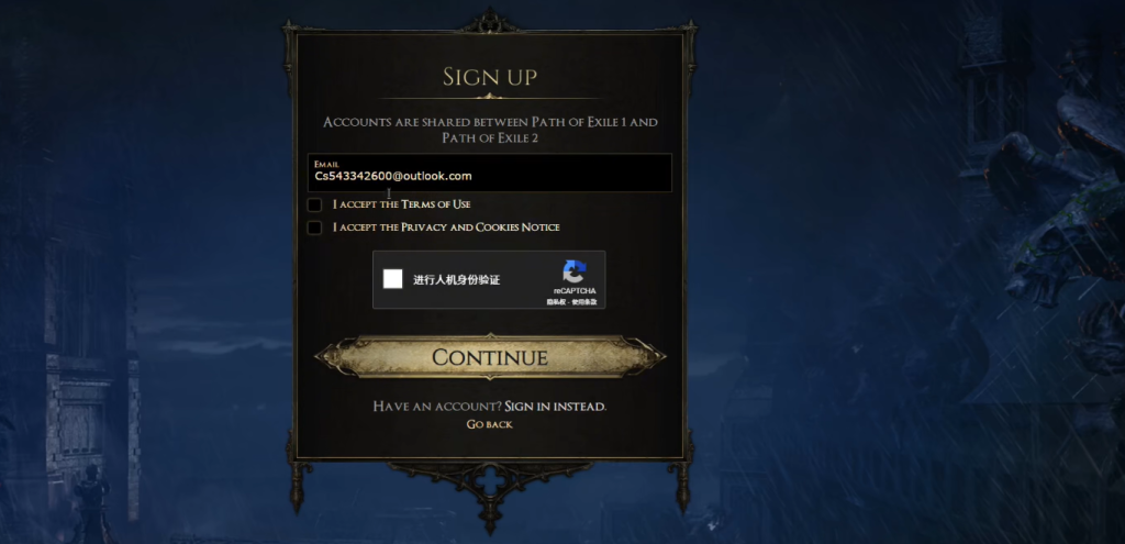 在官网右上角点击“创建账号”,填写邮箱、密码等基本信息,完成人机验证后点击“继续”。