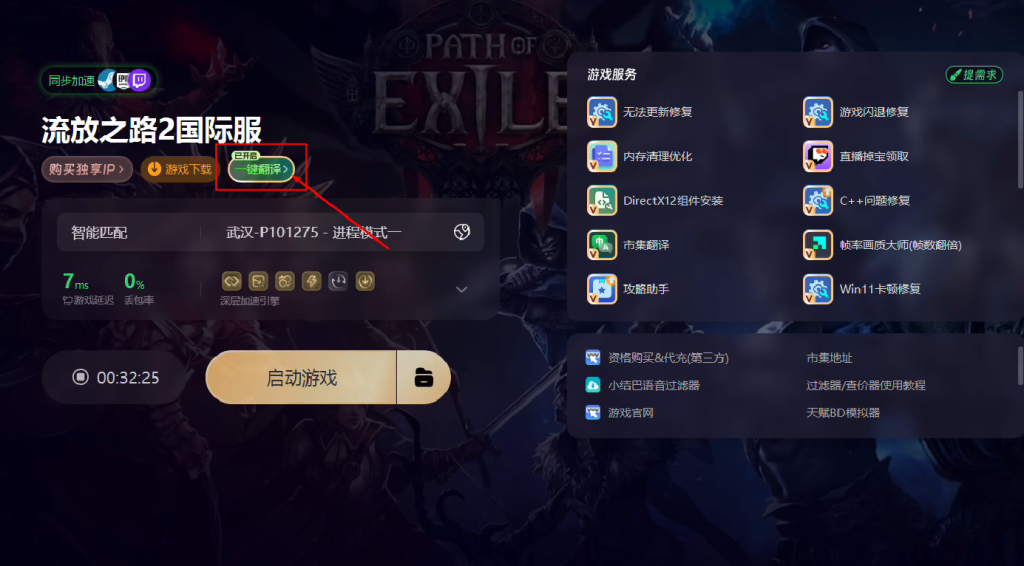 登录游戏后,通过奇游加速工具的“一键翻译”功能实现快速汉化,无需手动调整游戏文件。