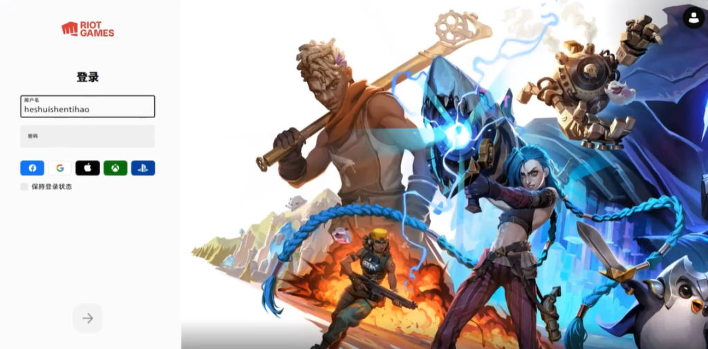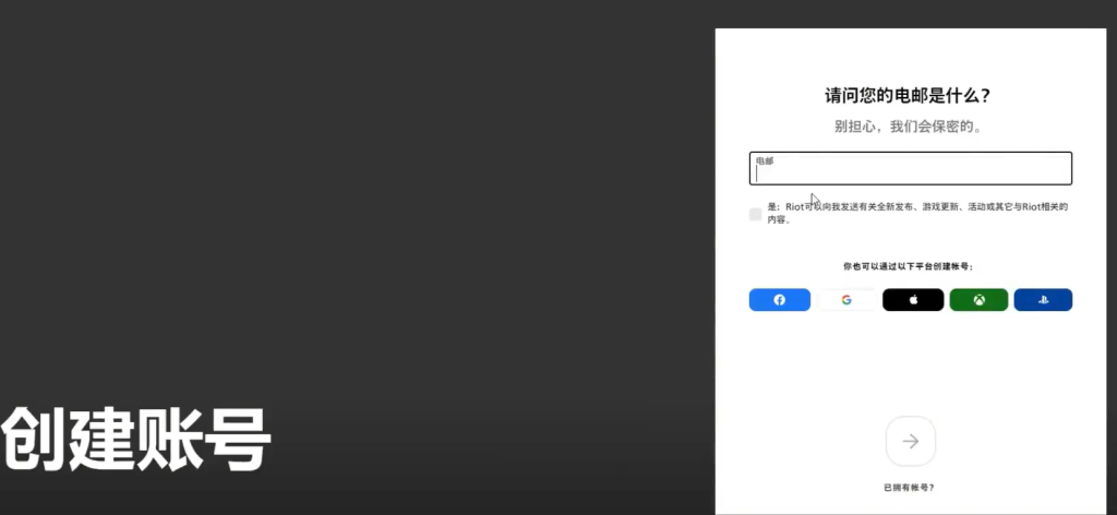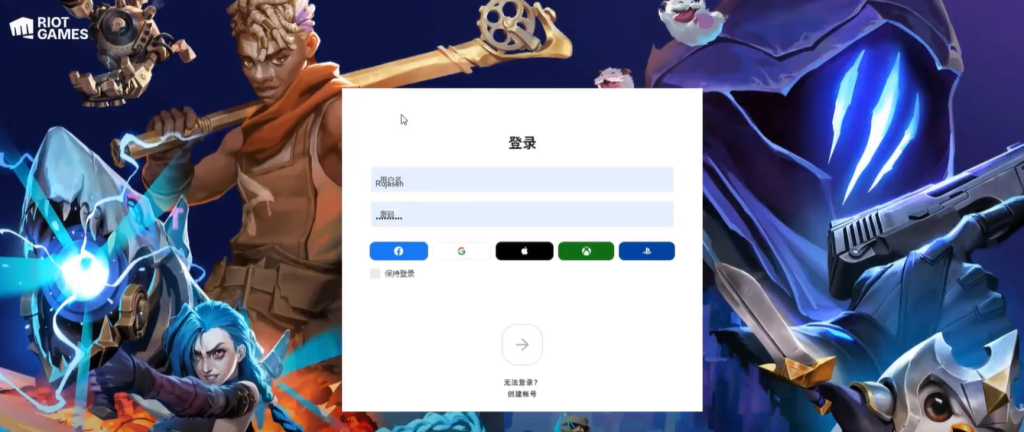 接着点击左上角的拳头图标,在弹出的选项中选择服务一栏里的Riot Games。进入新页面后,点击右上角登录,再点击下方创建账号。