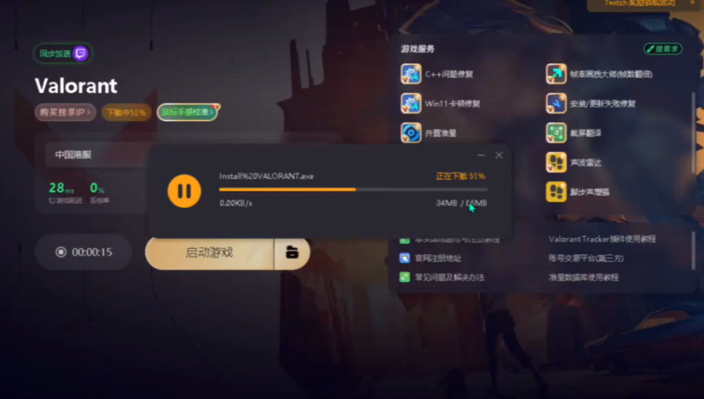 注册成功后回到奇游加速工具界面,点击右侧游戏下载,下载拳头客户端。安装文件的路径中不能出现中文,否则可能导致安装或运行出现问题。