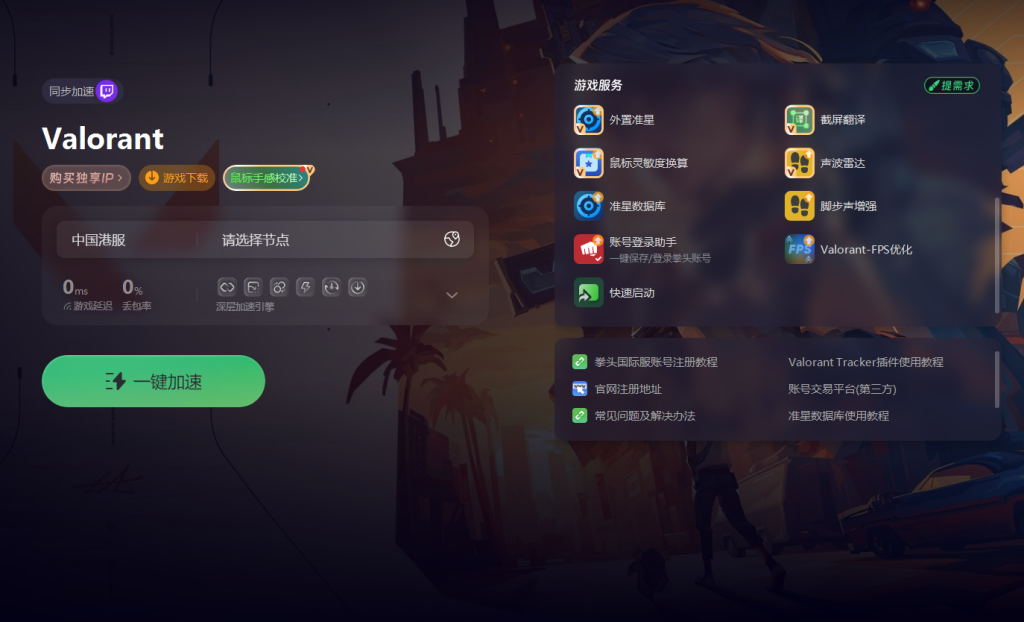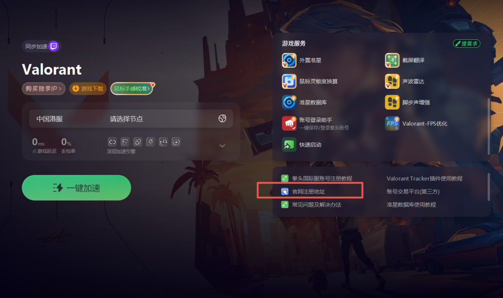 首先在开始操作前,需要准备好拳头账号、拳头客户端以及奇游加速工具。打开奇游加速工具,在搜索栏输入VALORANT,选择想要加速的区服,后续账号注册地址将与所选区服对应,这里我们以港服为例进行加速。