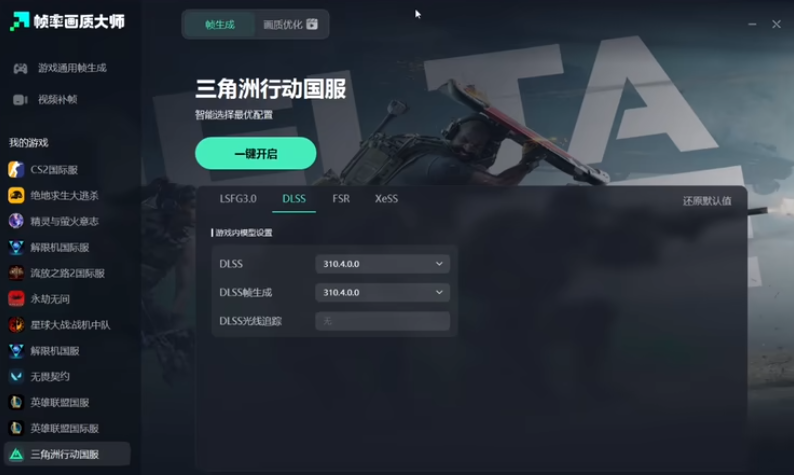 进入之后选中“三角洲行动”,找到帧生成设置项,把DLSS和DLSS帧生成两项都调整为最新的3E0.4模型。到这里先别点“一键开启”,否则打开游戏时很可能报错。