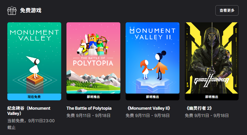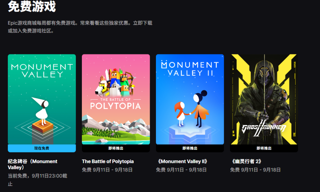 Epic平台一般在每周四晚上11点(北京时间)更换免费游戏,每一批游戏持续提供一周。如果这周忘记领了,那就只能等以后它再次免费,或者留意其它优惠活动了。Epic 本周送出的游戏是《纪念碑谷(Monument Valley)》,下周送出的游戏是《幽灵行者 2》《低模之战》《纪念碑谷 2》。