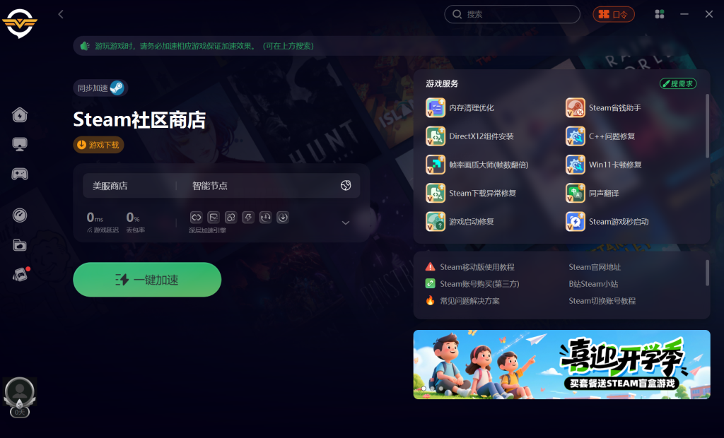 启动奇游加速器后,在软件内搜索并选择 “Steam 社区 / 好友服务” 或 “Steam 好友网络” 对应的专项节点进行加速,注意此处需选择针对好友服务的节点,而非仅对单个游戏进行加速。特别提醒:完成加速操作后,必须将 Steam 客户端完全退出,之后重新启动,这样才能让新的网络配置生效,确保好友网络连接恢复正常。