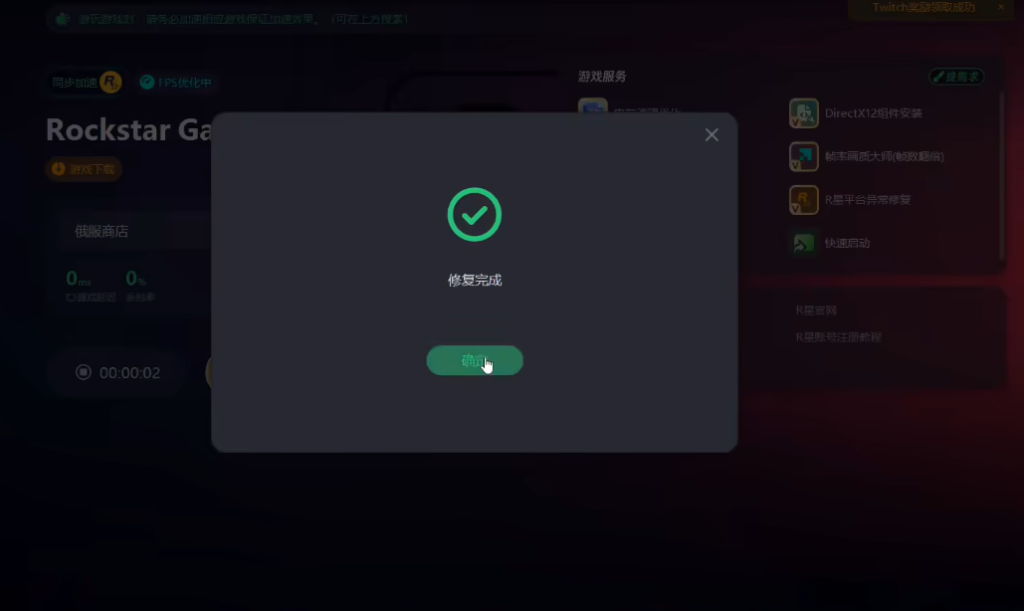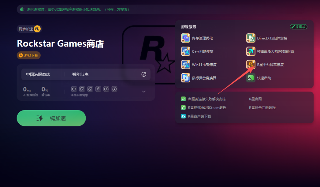 当出现验证错误时,有可能是 R 星平台自身存在一些临时性的故障或异常。此时使奇游加速工具提供的平台异常修复功能,能够对平台的各项设置和运行状态进行全面检查和修复,解决可能存在的软件冲突、文件损坏等问题,使平台恢复正常运行。