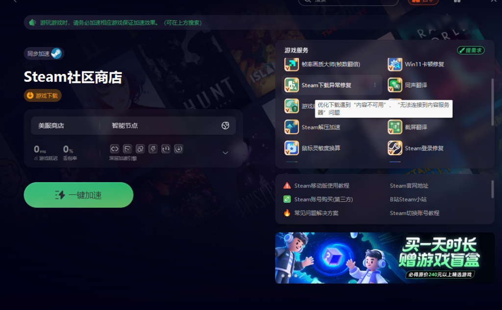 奇游加速工具提供了针对Steam问题的专项修复功能。玩家可以点击加速工具右侧的Steam修复按钮,让工具自动检测并修复可能存在的问题,如网络配置错误、客户端文件损坏等。修复完成后重新打开Steam,就能顺利进入购买页面了。