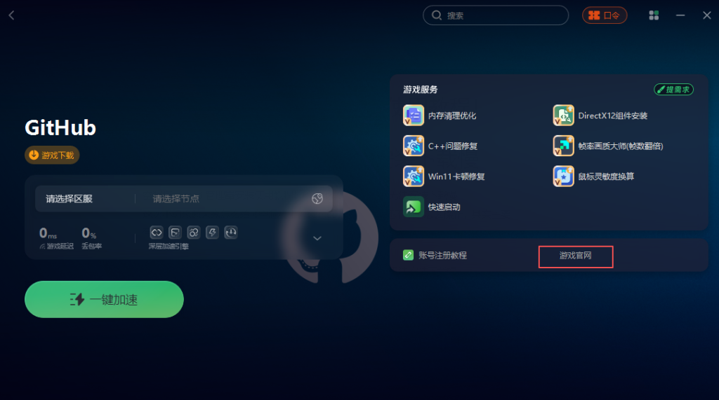 第一种是用圣甲虫mod工具,不会用的话可以跟着我做。首先打开奇游加速工具,搜一下GITHUB,加速一下。加速好了之后,点右边进官网。