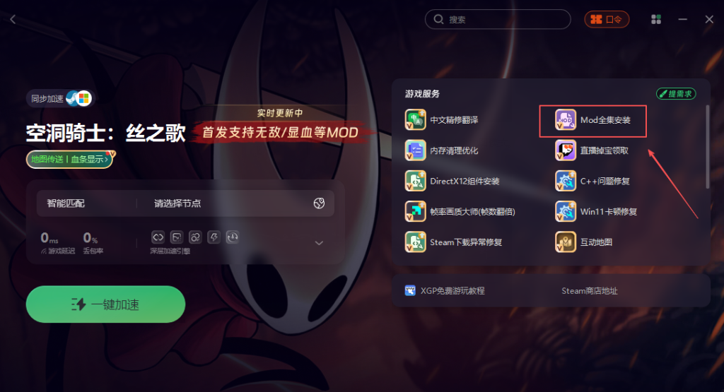 要是你觉得上面这种方式太麻烦,也有更简单的方法。直接用奇游加速工具搜“空洞骑士”,加速之后点右边“mod全集一键安装”。