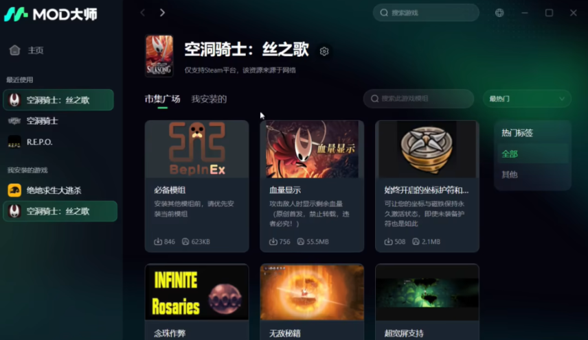 以上就是关于空洞骑士丝之歌Mod一键安装教程 血条显示,地图解锁,传送mod,希望能帮助到大家。