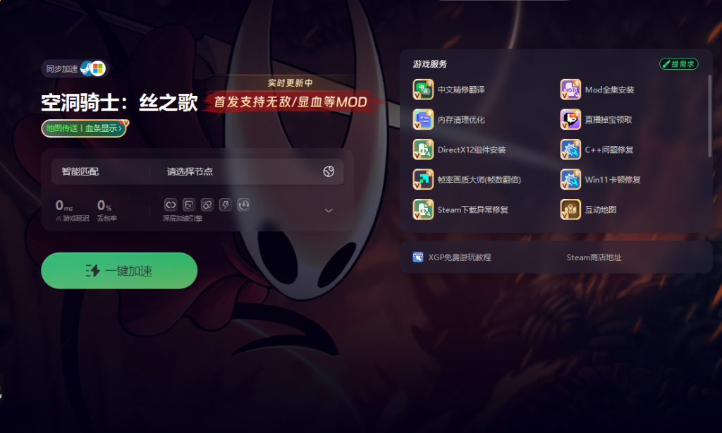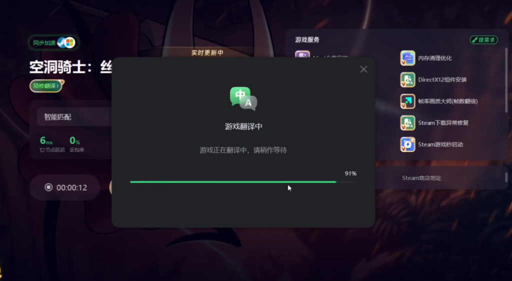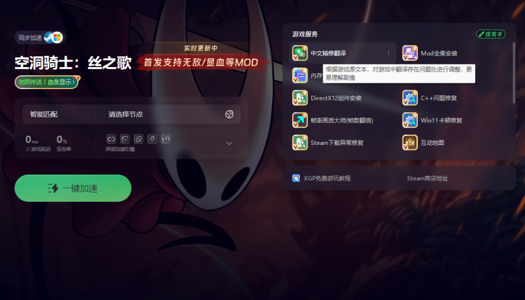 首先需要借助奇游加速工具,打开奇游后一键加速空洞骑士:丝之歌在加速界面右上方输入口令“QY666”,获取额外的加速时长。加速完成后,点击精修翻译选项。
