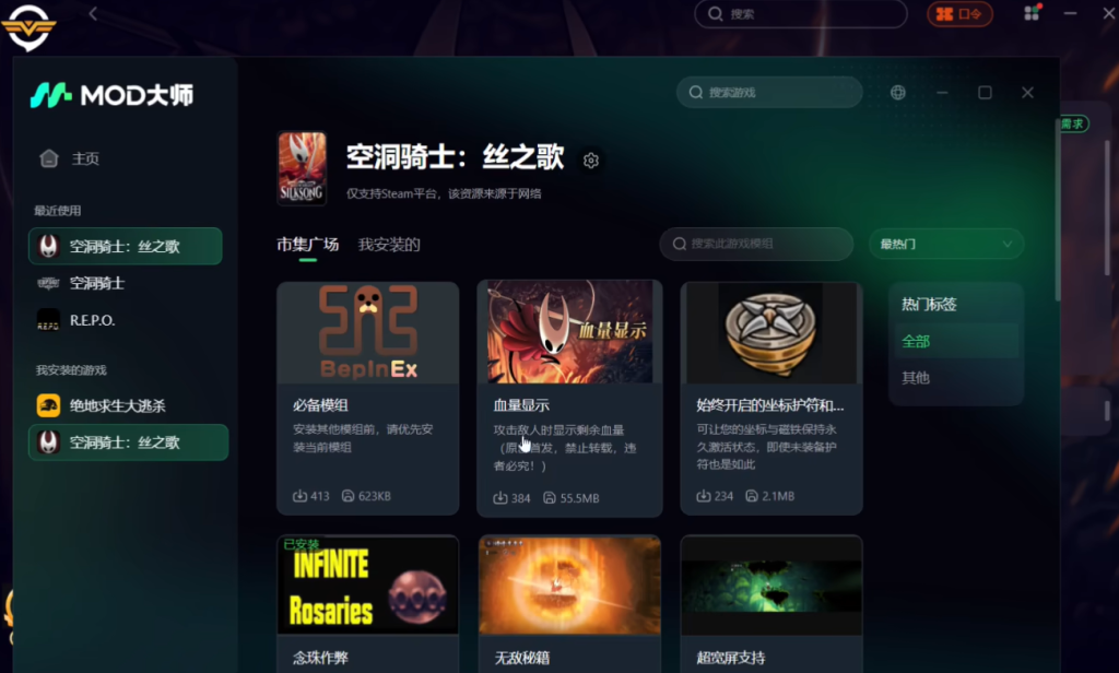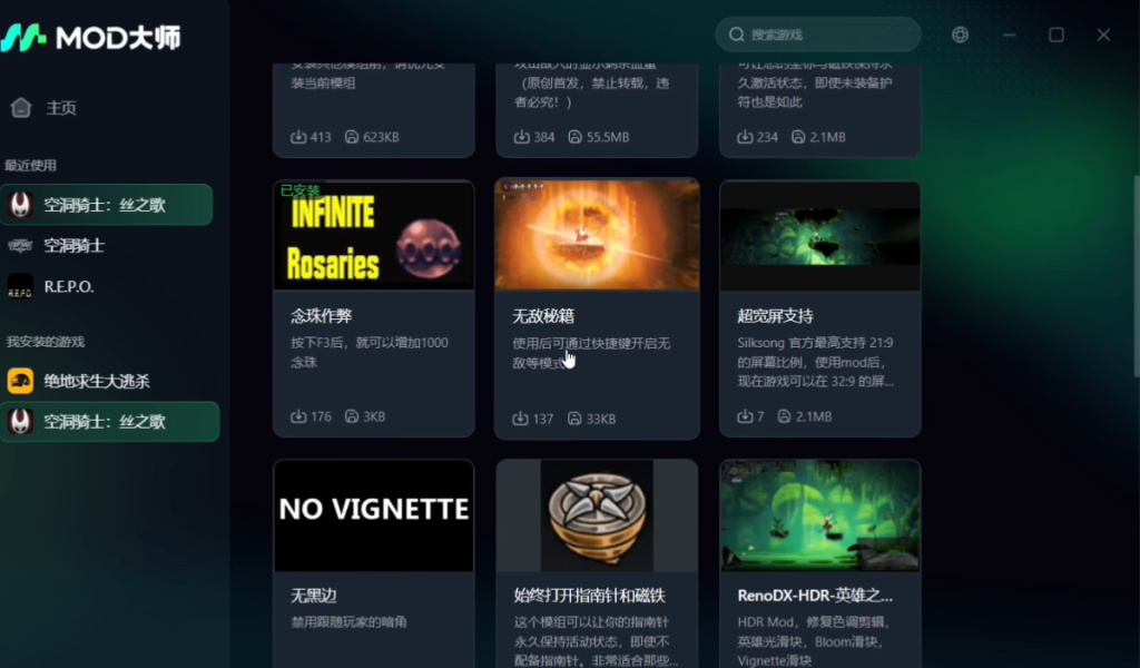 这里有实用的血条显示MOD,还有念珠作弊MOD可供选择;更有无敌秘籍MOD,开启后角色将处于无敌状态,还能拥有无限丝。此外还有其他各种有趣的MOD,大家可以根据自己的需求自行安装。