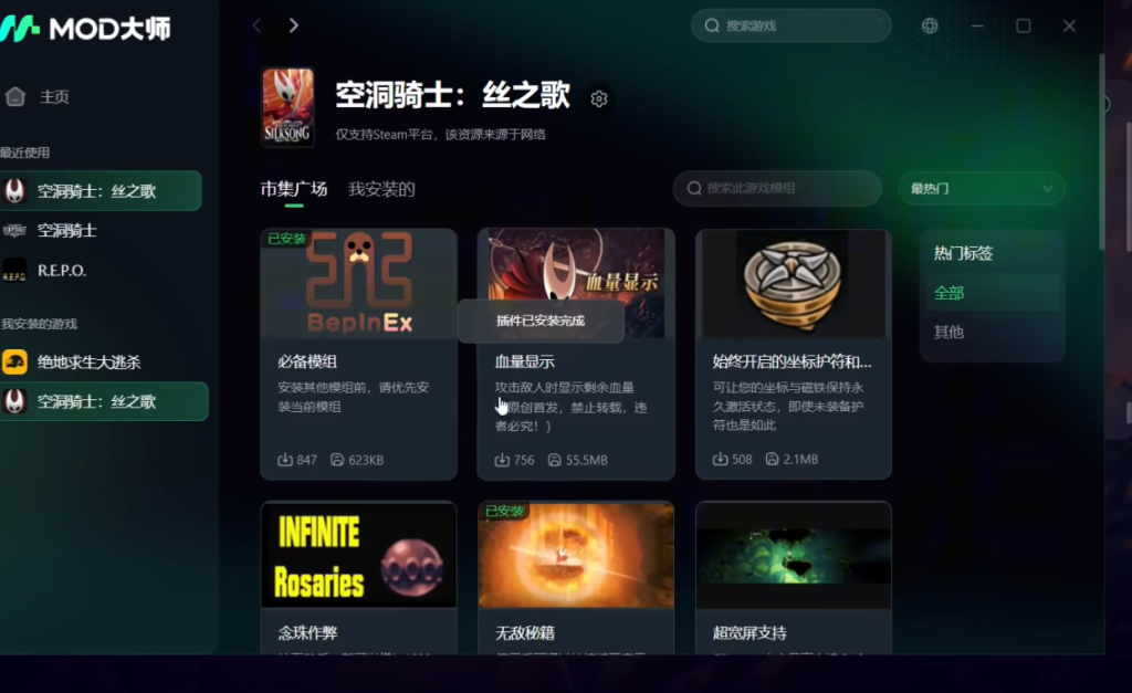 空洞骑士地图MOD/皮肤MOD 一键解决无法安装下载慢问题