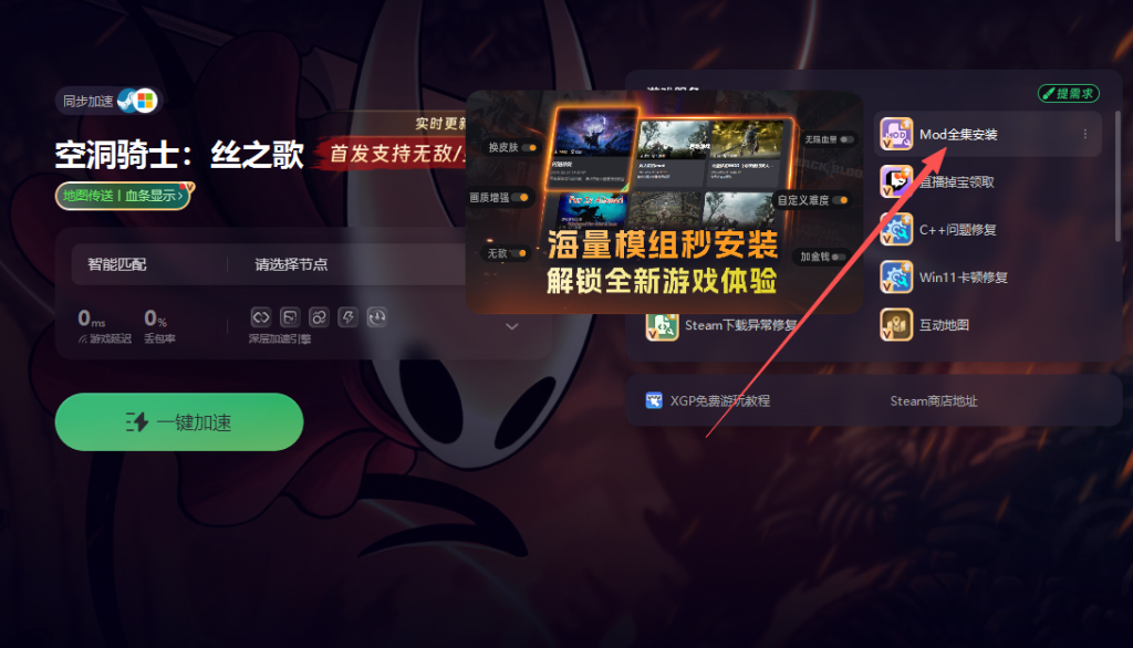 解决了下载问题后就可以安装MOD了。同样先打开奇游加速工具,点击右侧的MOD全集一键安装选项。