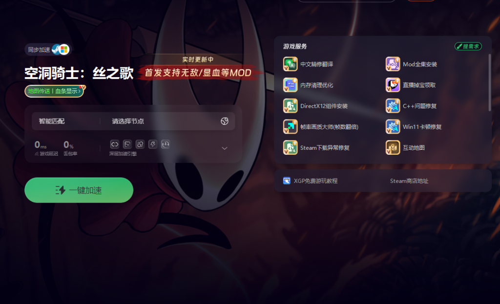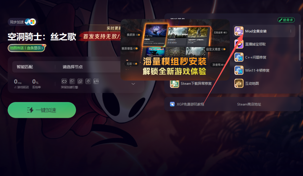 开启奇游加速工具并完成对空洞骑士:丝之歌的加速后,点击工具中的MOD功能。这些MOD都经过了奇游的精心分类整理,方便玩家根据自己的需求进行挑选。
