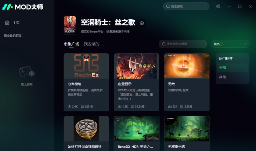 目前提供的MOD包括:显示血条、念珠作弊等功能,还有“无敌模式”MOD——开启后角色不会死亡,并且丝线数量无限。此外也有其他趣味模组,大家可以按需安装。