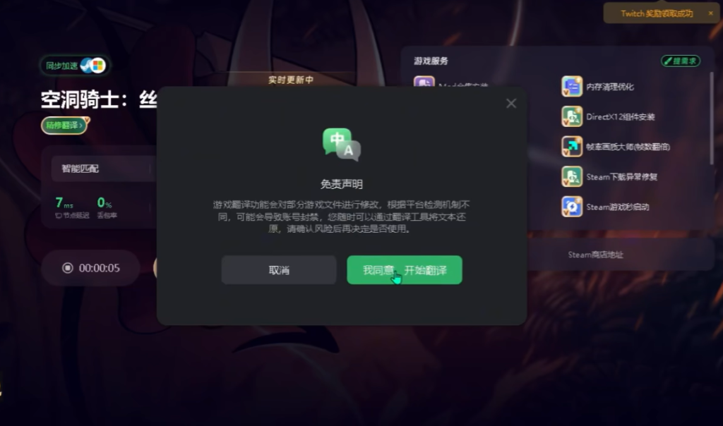 点击精修翻译按钮,系统会弹出相关提示窗口,仔细阅读提示内容后,点击同意按钮。完成这一操作后,游戏就会自动应用精修汉化翻译,原本不通顺且意思偏差的文本将被替换为更准确、流畅的翻译。