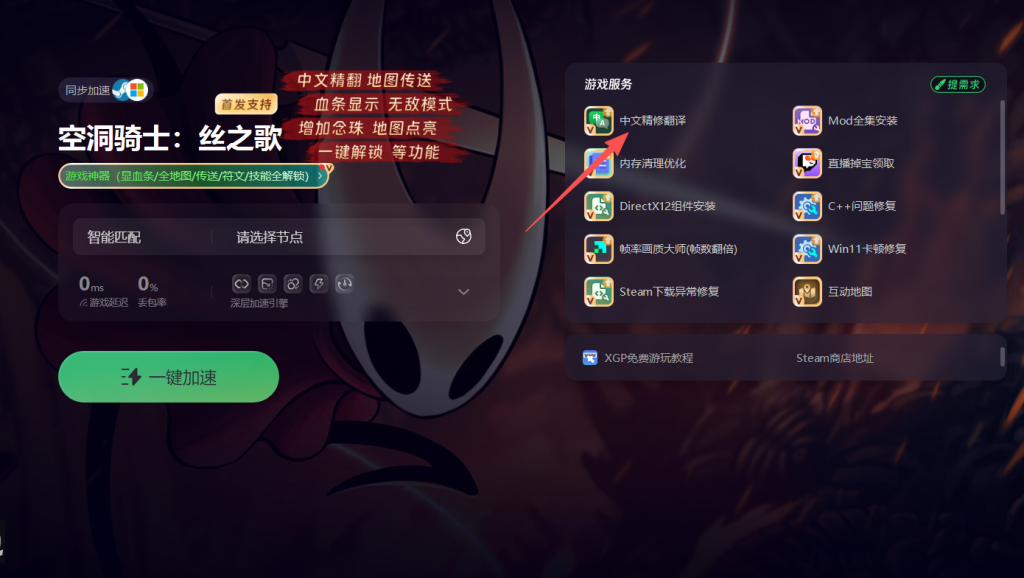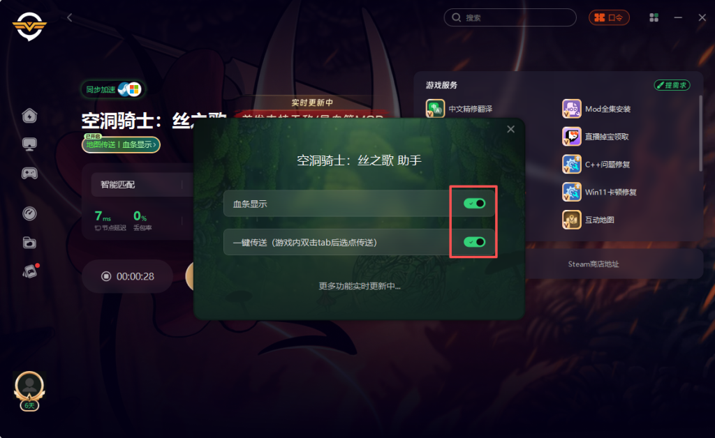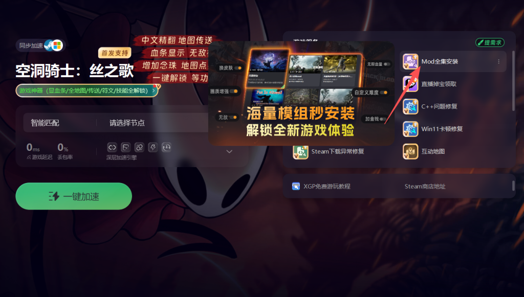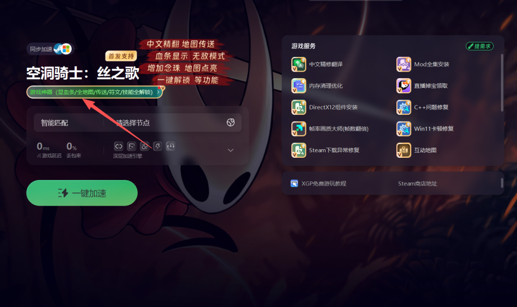 首先安装奇游加速工具,打开后对空洞骑士:丝之歌进行加速。加速完成后,在加速界面找到地图传送血条显示选项并点击进入,将血条显示和一键传送功能开启。