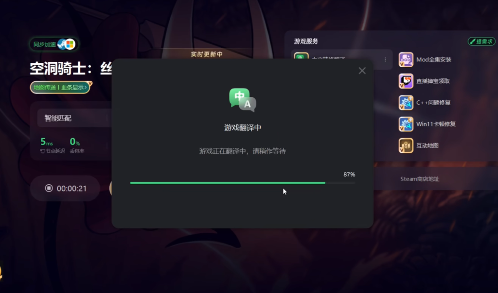 首先准备好奇游加速工具,对该游戏进行加速操作。加速完成后在加速界面找到精修翻译选项。