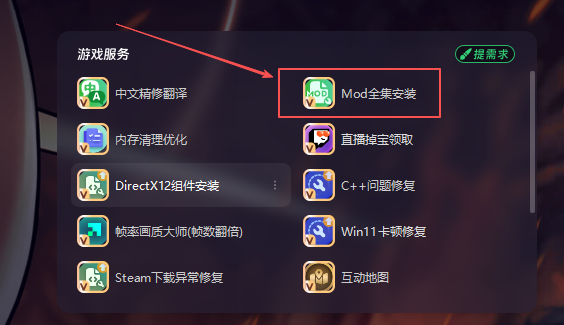 请注意,在使用这些功能前,需要先在游戏中解锁地图部分。只有地图可用,MOD的相关功能才会正常生效。接下来回到工具页,选择“MOD合集安装”。