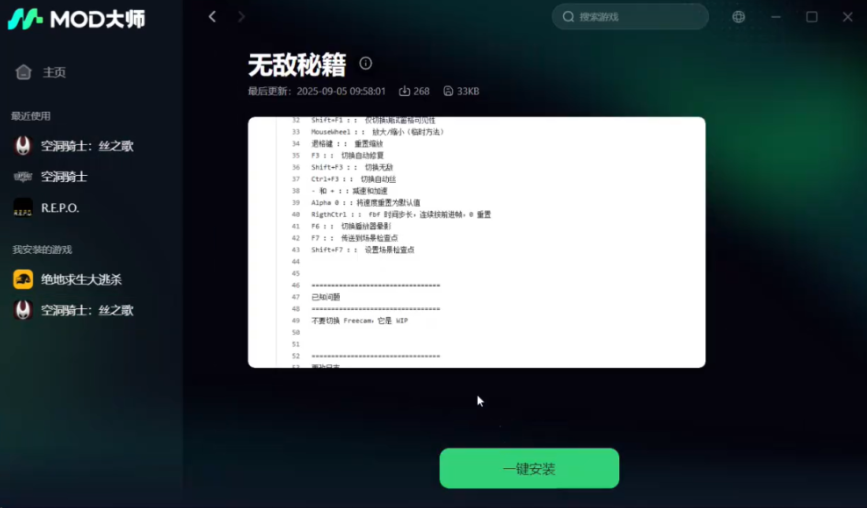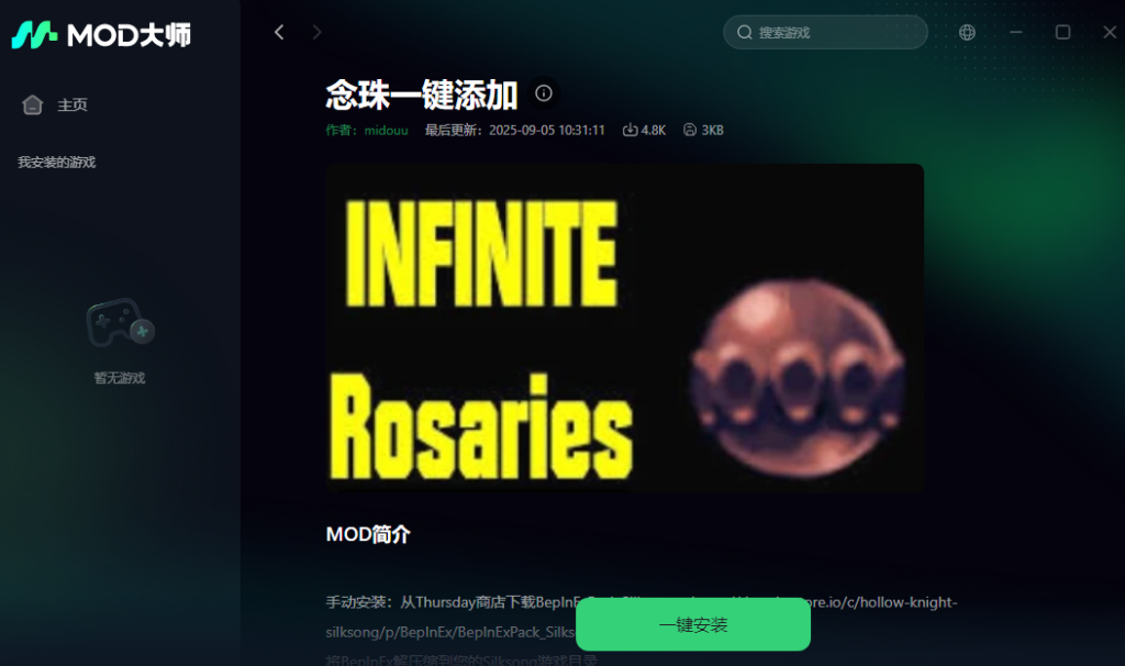 完成基础模组后,就可以按自己的喜好安装其他功能MOD了,比如“念珠作弊”或“无敌模式”等等。工具中还提供了许多有趣的模组,大家可以根据需要自行尝试。