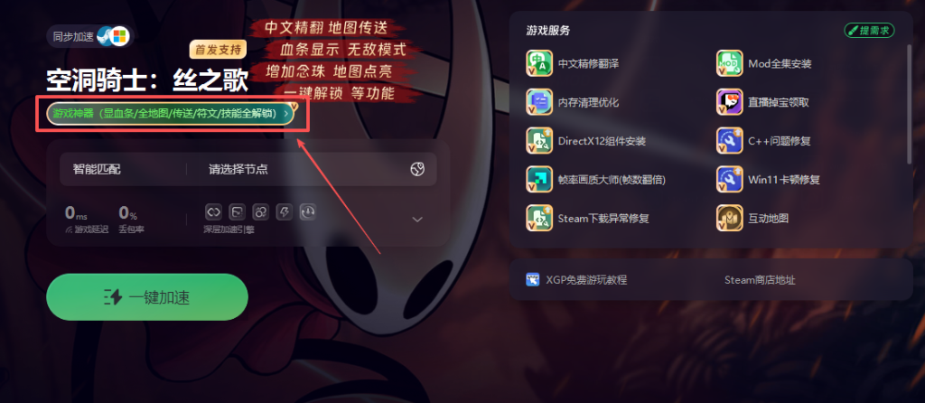 首先,你需要准备一个网络加速工具,比如“奇游”。打开之后搜索《空洞骑士:丝之歌》,启动加速功能。这样做能够改善网络状态,让后续安装及游戏过程更顺畅。