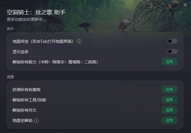 玩家们进入游戏后,就能一键解锁所有收集品、能力和符文技能。如果已经拿到了地图,还能直接全图点亮,并且随时随地传送。此外,还能开启角色无敌状态、增加念珠数量等各种实用功能。想操作的话,接下来就带大家一步步实现。