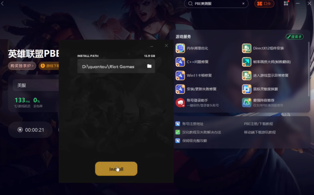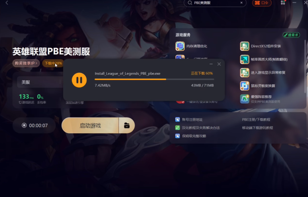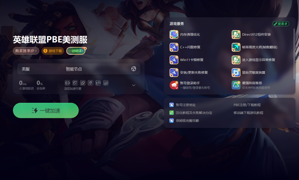 若想体验美测服先准备一个奇游加速工具。进入加速器后,在右上角输入PBE520,就能获取美测服账号以及加速时长。接着搜索PBE 美测服一键加速,完成后点击游戏下载。
