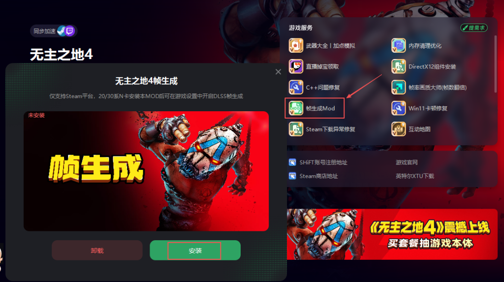 如果你是20系或30系显卡用户,可以试试在奇游加速工具里安装一个“帧生成mod”,装上之后游戏里就能开启帧生成功能了。