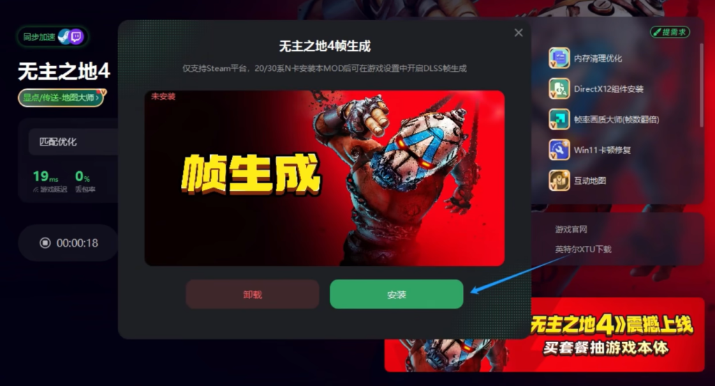 在加速器界面找到帧生成mod点击安装。安装完成后开启帧生成功能,就能有效提高游戏帧数,让战斗画面更加流畅顺滑。