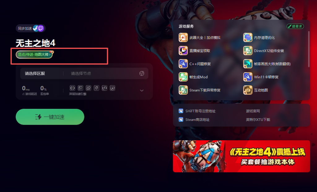 首先打开奇游加速工具,在搜索栏中输入无主之地4,找到游戏后点击。接着在加速界面前点传送地图大师选项,点击后设置好快捷键,并将对应的两个开关打开。