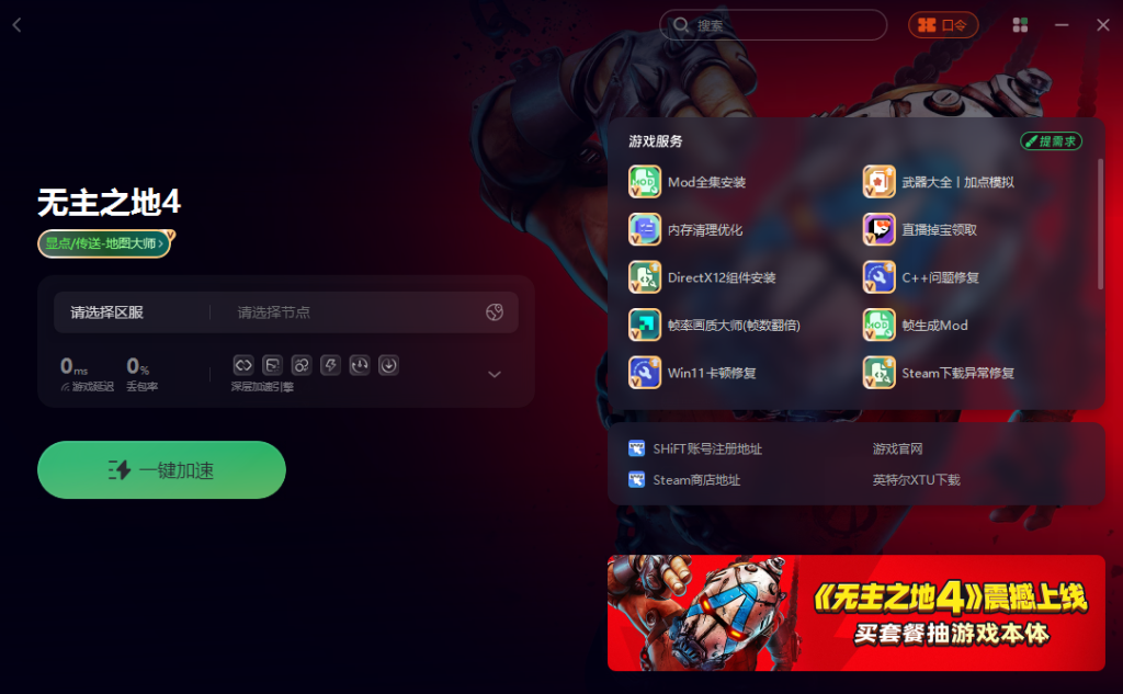 在打开《无主之地4》过程中,打开奇游,搜索“无主之地4”。优化电脑本地网络的环境,从而解决因网络问题导致的进不去游戏、启动失败、DX12报错、闪退或崩溃等情况,顺利解决问题。