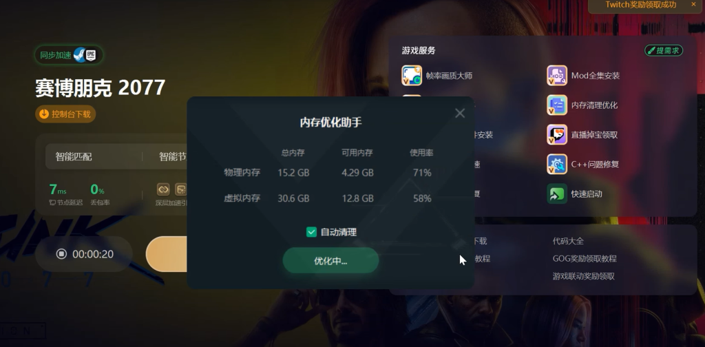电脑内存占用过高也可能导致游戏无法正常运行,出现进不去、打不开以及mod失效等问题。可以使用奇游加速工具右边的内存清理优化工具,对电脑内存进行清理和优化,释放被占用的内存空间,为游戏运行提供充足的资源。