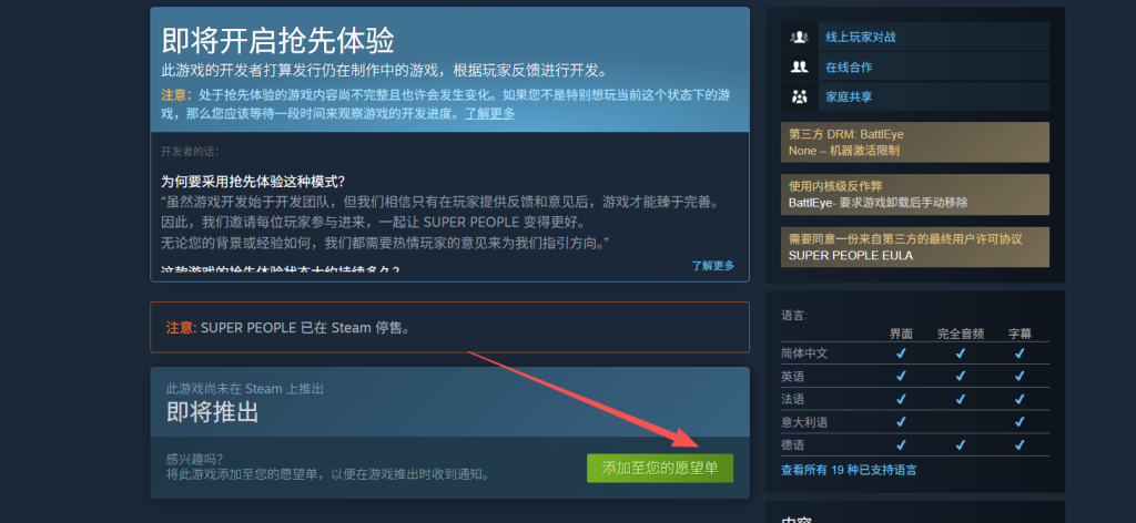 在游戏界面中,点击添加至愿望清单,然后耐心等待游戏正式上线。待游戏上线后按照提示下载安装,就能第一时间开启你的游戏之旅啦。