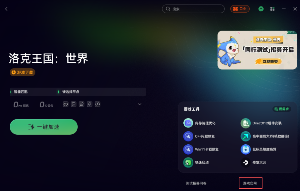 第二种是走官方渠道。我们同样先加速《洛克王国世界》,然后从右侧入口进入游戏官网。
