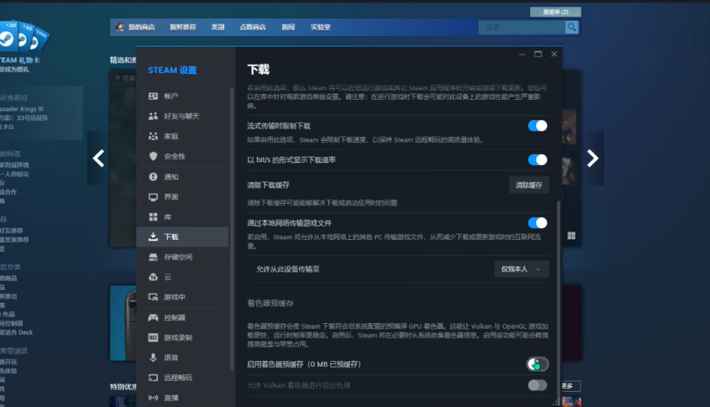 对于Steam平台上的游戏,下载设置也可能对游戏运行产生影响。玩家可以在Steam商店的左上角设置中找到下载选项,找到这个着色器预缓存,将其关闭,然后重启steam启动游戏就可以了。