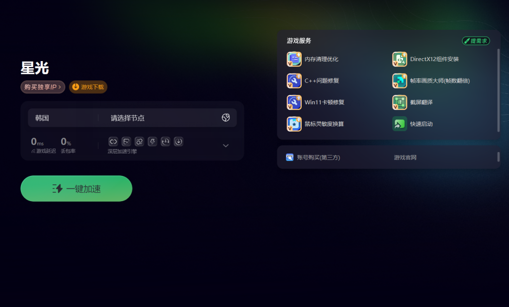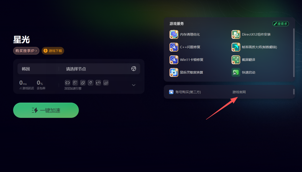 首先要提前准备好奇游加速工具。在加速工具搜索栏中输入星光,在右上角输入QY666领取使用时长。这里还贴心配备了一键汉化功能,方便后续游戏操作。