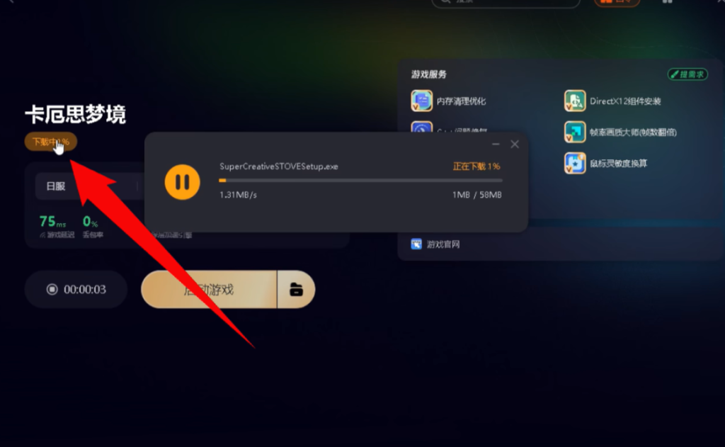 安装好客户端后打开客户端并登录之前注册或登录的账号。登录成功后在客户端内找到卡厄斯梦境游戏,点击下载按钮,开始下载游戏。