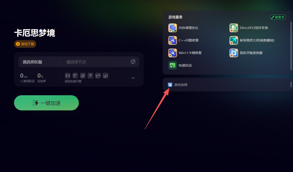 加速完成后点击加速器界面右侧的游戏官网链接,进入官网。