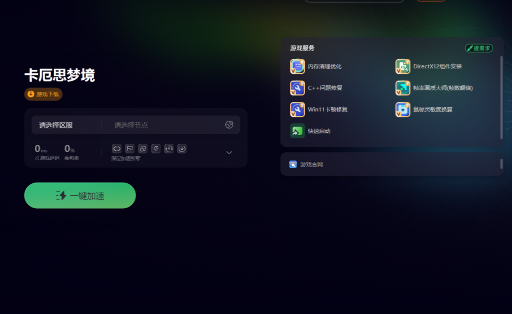 由于卡厄斯梦境游戏官网存在访问限制,直接裸连是无法进入的。需要先准备一个奇游加速工具。打开加速器后在搜索框中输入卡厄斯梦境,点击加速按钮。