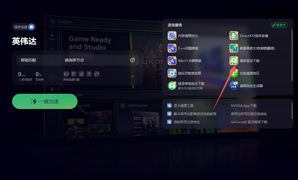 打开奇游搜索并加速英伟达,然后点击最新驱动下载,按照提示完成更新。