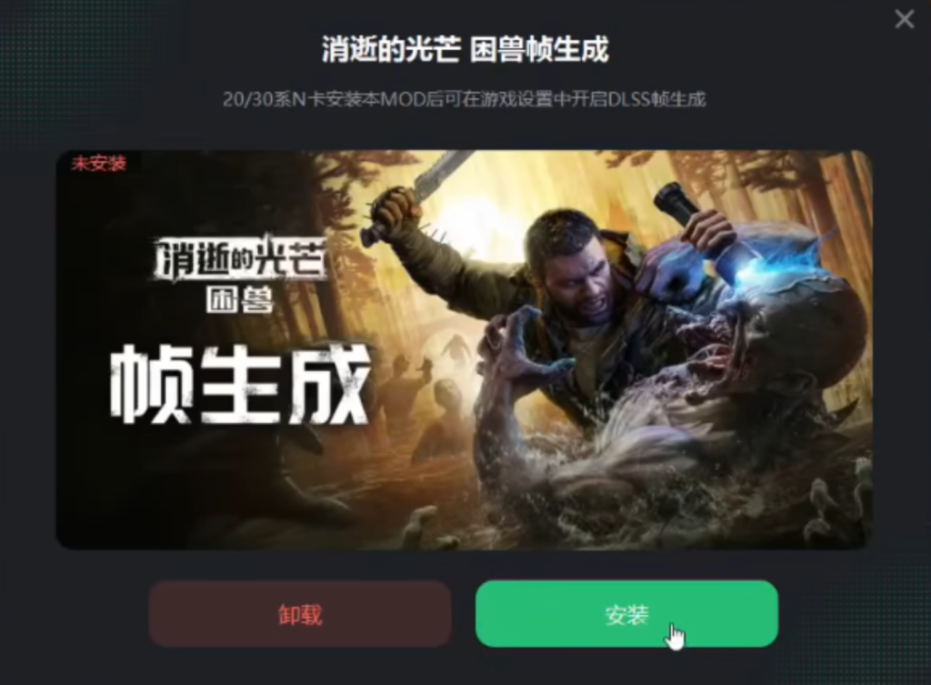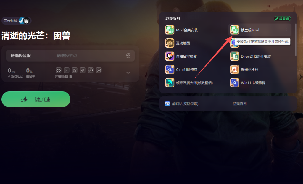 如果显卡是 40 系以下,无法开启游戏自带的帧生成功能,也无需担忧。使用奇游加速消逝的光芒:困兽,在加速界面找到帧生成工具并安装。